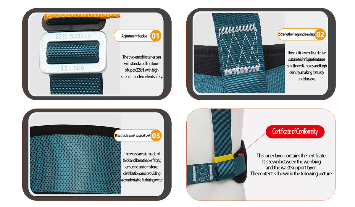 4. Reinforced Hardware: Equipped with heavy-duty, thickened buckles and fittings rigorously tested to withstand forces exceeding 22 kN. This guarantees exceptional strength and superior safety performance.