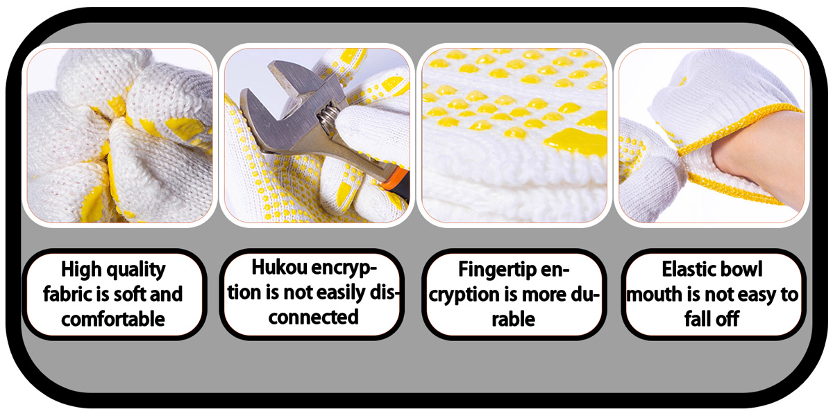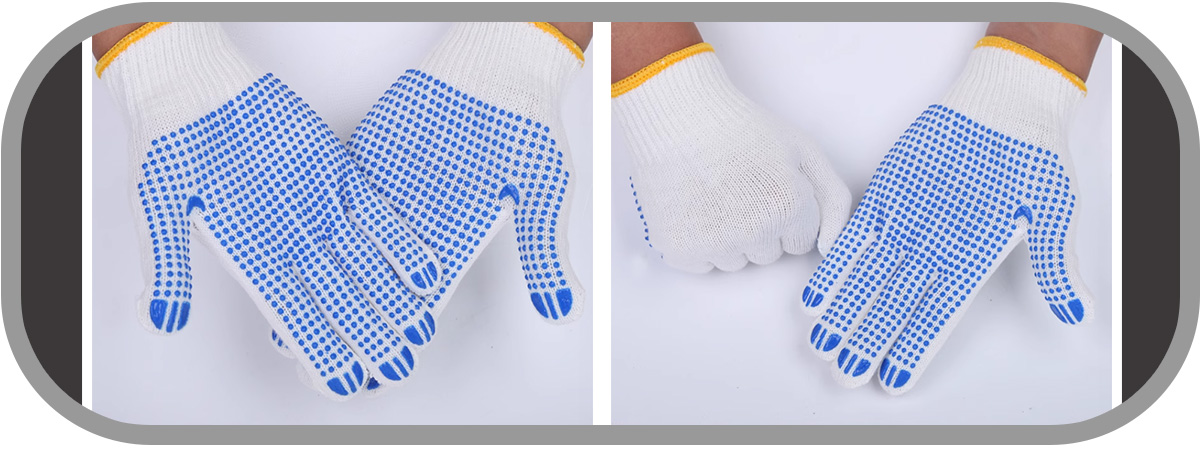 1.Crafted for superior grip and lasting performance, these gloves combine a soft bleached cotton yarn base with a strategically applied PVC dotted coating for excellent non-slip control.